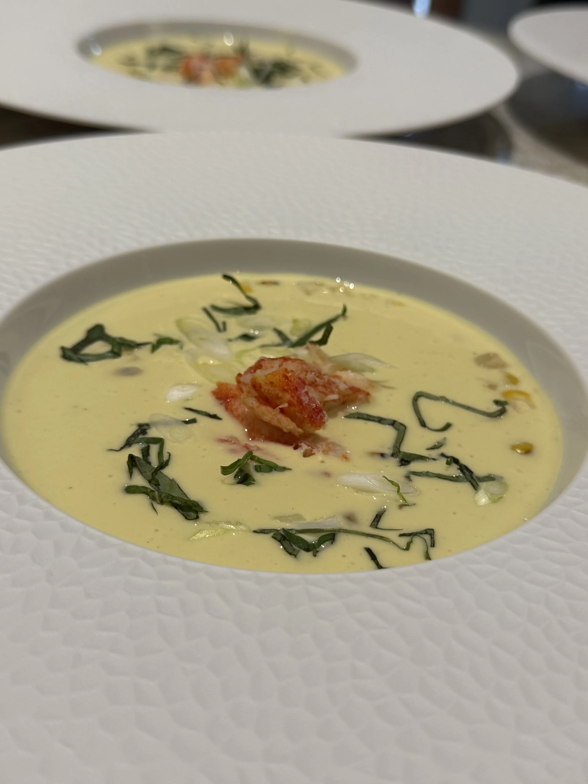 Cream of Asparagus Soup, Charred Asparagus Tips, Crispy Shallots